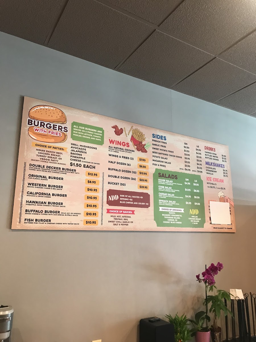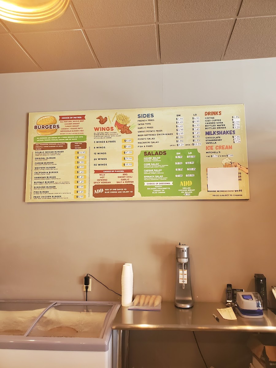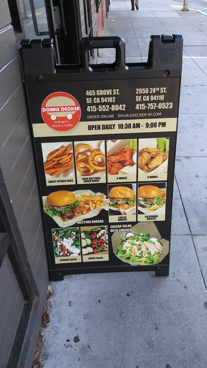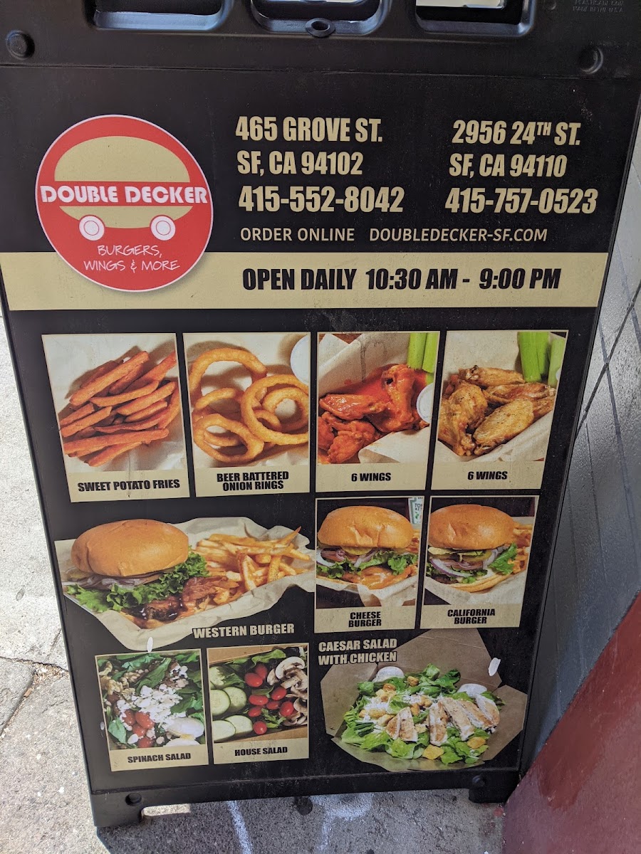 Double Decker in San Francisco offers a straightforward and satisfying menu, perfect for any craving. For burger lovers, the Cheese Burger, Double Decker Burger, Original Burger, California Burger, and Hawaiian Burger make up their grilled burger selection. Whether you’re in the mood for something classic or a bit more adventurous, these burgers deliver tasty options. Buffalo wings are also a highlight, with options ranging from 3 Wings & Fries to larger servings like 50 Wings, making it an ideal choice for sharing. On the lighter side, you can enjoy a variety of salads, including the House Salad, Caesar Salad, Spinach Salad, and Cobb Salad. Sides like French Fries, Sweet Potato Fries, Garlic Fries, Onion Rings, and Macaroni Salad complement the main dishes, adding extra flavor to your meal. For dessert, indulge in Ice Cream for a sweet treat. As for drinks, there’s a solid choice of Canned Soda, Bottled Soda, Bottled Water, Coffee, and Milkshakes to quench your thirst. Whether you're dining on a regular day or over the weekend, the offerings are consistent, ensuring a satisfying experience every time.